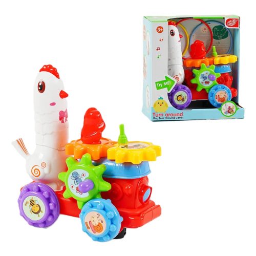 Vidám, színes interaktív vonat játék, amely többféle módon szórakoztatja a gyerekeket. A forgatható fogaskerekek fejlesztik a kézügyességet, míg a csirkére dobható karikák játékosan segítik a koordinációt. A játék elemmel működik, így képes mozogni és hangokat adni, ami még izgalmasabbá teszi a játékélményt. Strapabíró műanyagból készült, élénk színei felkeltik a gyerekek figyelmét. Ideális választás készségfejlesztő játéknak és ajándéknak.
